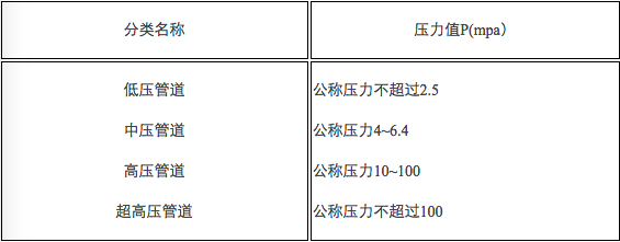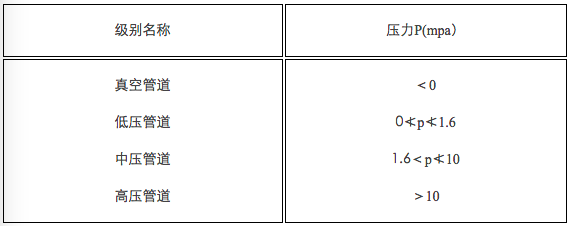 在《工業(yè)管道工程施工及難收規(guī)范 金屬管道篇》(GB235 -82)中,將工業(yè)管道分類真空管道、低壓管道、中壓管道、高壓管道四級(jí),其分類標(biāo)準(zhǔn)列于表1--1-6 ;