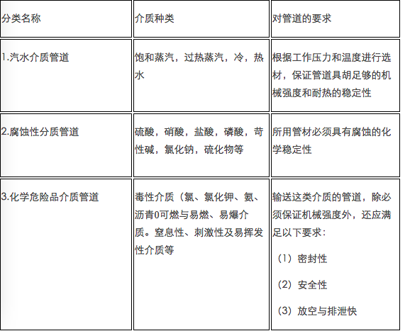不同性質(zhì)的介質(zhì)對(duì)管道的要求不同,可參見(jiàn)表1-1-9。