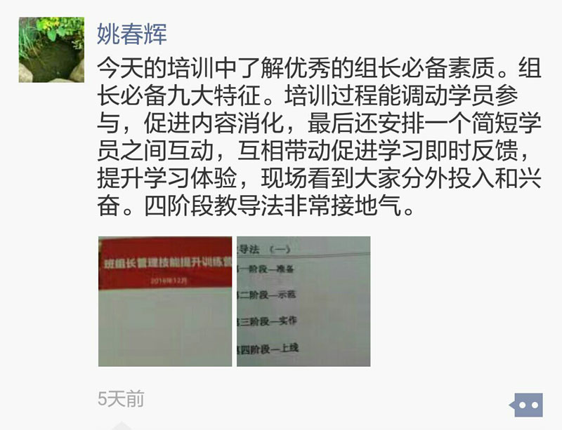 培訓(xùn)期間,一線班組長主要強化技能訓(xùn)練,在角色認知和團隊建設(shè)方面有了新的認識,比如該怎樣成為中堅力量。他們也通過“接地氣”的案例,了解到“四階段教導(dǎo)法”,還提高了問題分析與解決的技巧。