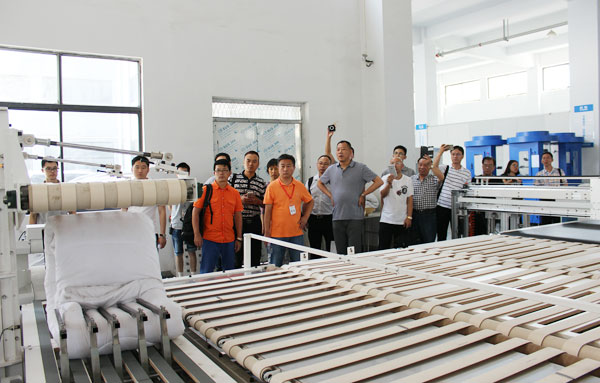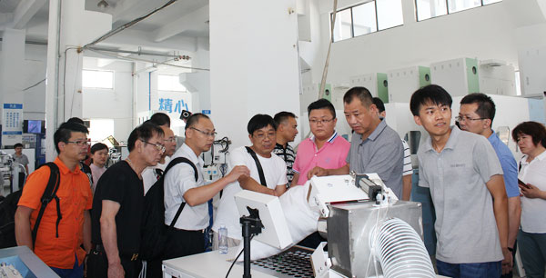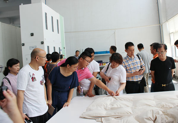隨后,專家和企業(yè)代表們走進(jìn)百聯(lián)生產(chǎn)車間,重點觀看了1202B羽絨被充絨機(jī)、全自動折疊機(jī)、全自動棉枕芯機(jī)以及101型商超羽絨被充絨機(jī)等產(chǎn)品的實物操作過程,對產(chǎn)品功能、性能有了直觀的了解,對家紡自動化整體解決方案給予了高度的評價,并結(jié)合家紡生產(chǎn)中的具體問題進(jìn)行了咨詢,也提出了需求和建議。