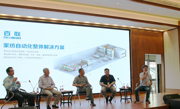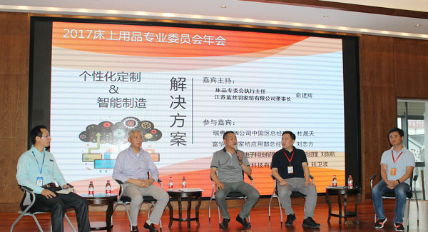 就在床品行業(yè)專家和企業(yè)代表訪問百聯(lián)總部的前一天, “2017床上用品專業(yè)委員會年會”在吳江召開。來自床品行業(yè)及關(guān)聯(lián)行業(yè)的200多位代表齊聚一堂,共同探討和總結(jié)了床品行業(yè)的現(xiàn)狀,從做強產(chǎn)品、技術(shù)革新、渠道升級等方面共商未來發(fā)展之路。公司董事長錢衛(wèi)波作為年會主題論壇的嘉賓,與在場的與會代表共同探討了“個性化定制及智能制造解決方案”在家紡生產(chǎn)升級中的作用,對百聯(lián)家紡自動化整體解決方案做了分享、解讀,臺下與會者反應(yīng)熱烈、積極互動,取得良好效果。