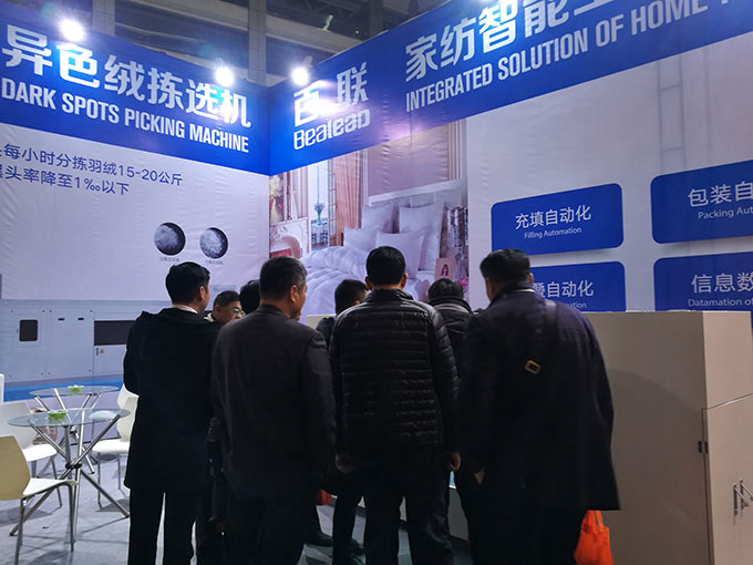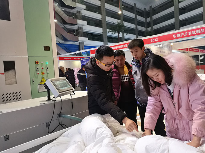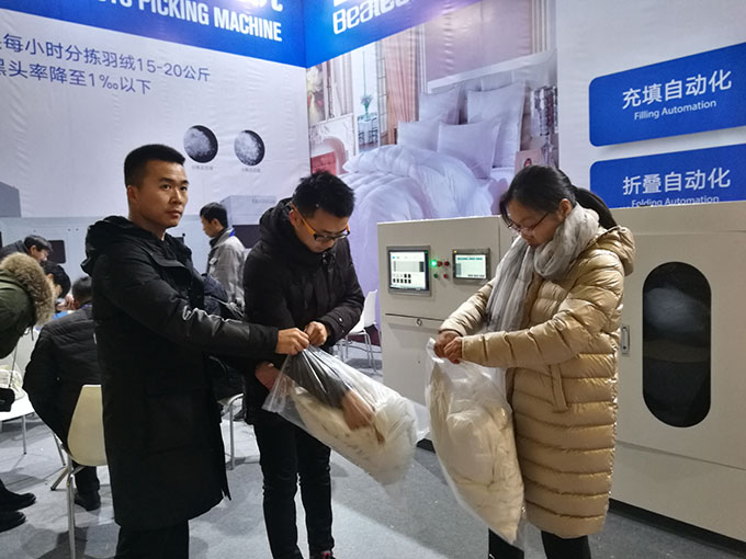 本屆羽博會期間,百聯(lián)側(cè)重對異色絨揀選機、1202羽絨被充絨機等產(chǎn)品的性能優(yōu)點進行現(xiàn)場演示,專業(yè)觀眾可自帶樣品試機,現(xiàn)場“檢驗”效果。