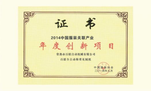 2014年度中國服裝大會暨新疆服裝產(chǎn)業(yè)發(fā)展高端論壇9月在新疆烏魯木齊隆重召開。中國服裝協(xié)會舉辦的“中國服裝關(guān)聯(lián)產(chǎn)業(yè)創(chuàng)新項目” 頒獎活動作為2014年度中國服裝大會的一項重要議程,9月5日,在烏魯木齊舉行。中國服裝協(xié)會會長王天凱、中國服裝協(xié)會名譽會長杜鈺洲兩位領(lǐng)導(dǎo)親自為十個優(yōu)秀創(chuàng)新項目頒發(fā)了獎牌。常熟市百聯(lián)自動機械有限公司的“百聯(lián)全自動稱重充絨機”創(chuàng)新項目喜獲此殊榮,并入選《2014“中國服裝關(guān)聯(lián)產(chǎn)業(yè)創(chuàng)新項目”匯編》。